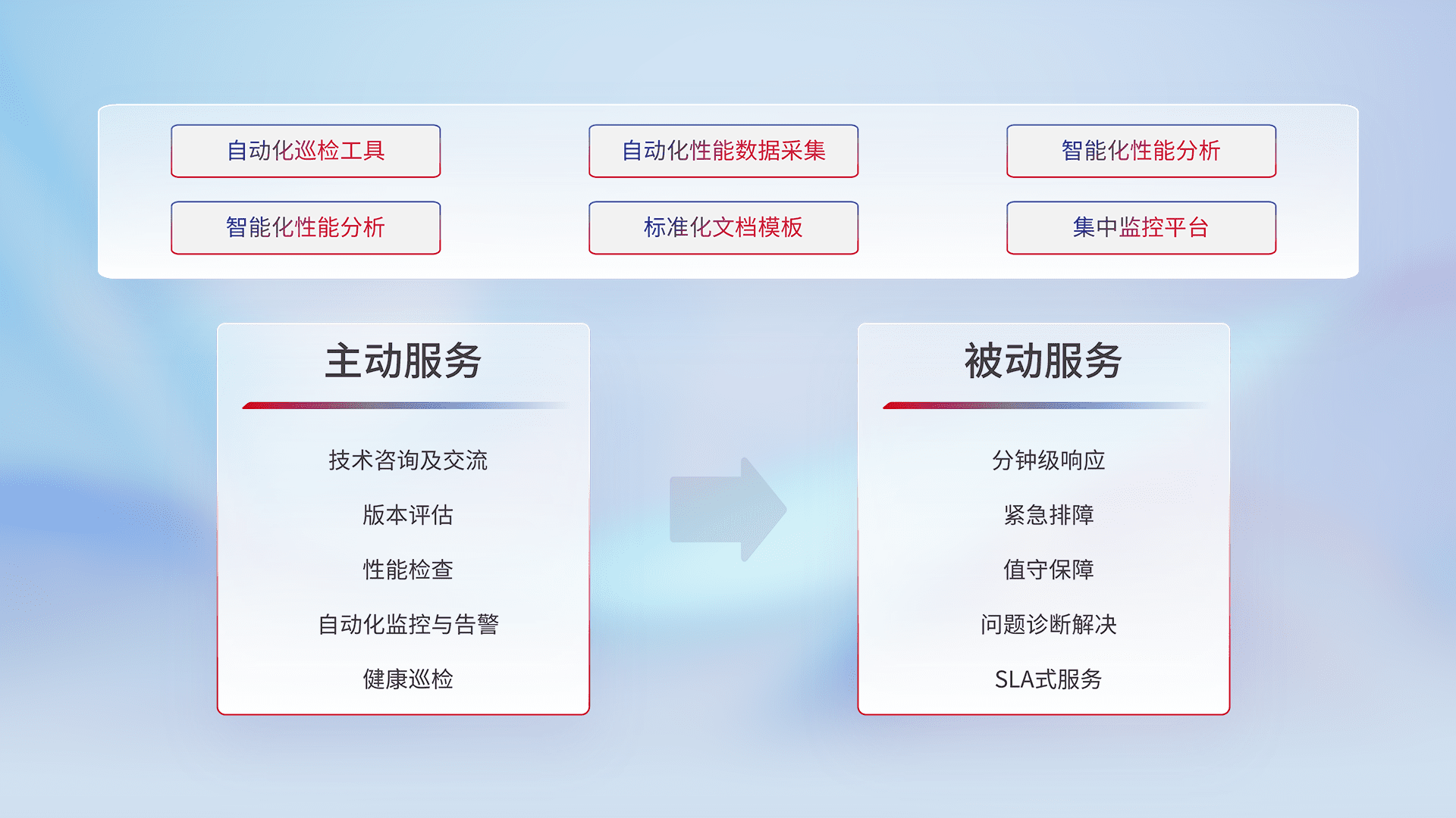 智能化工具和标准化文档,,保障服务质量,,提供主动服务(包含技术咨询、、、版本评估、、、性能检查、、、、自动化监控与告警、、、健康巡检)和被动服务包含(分钟级响应、、紧急排障、、、、值守保障、、、、问题诊断解决、、、SLA服务)。。。。